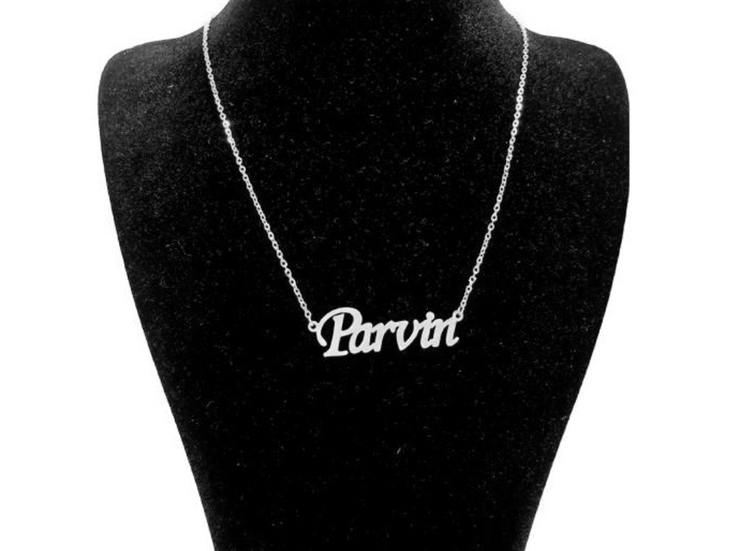 گردنبند نقره طرح اسم پروین به لاتین parvinمتصل به زنجیر نقره عیار ۹۲۵