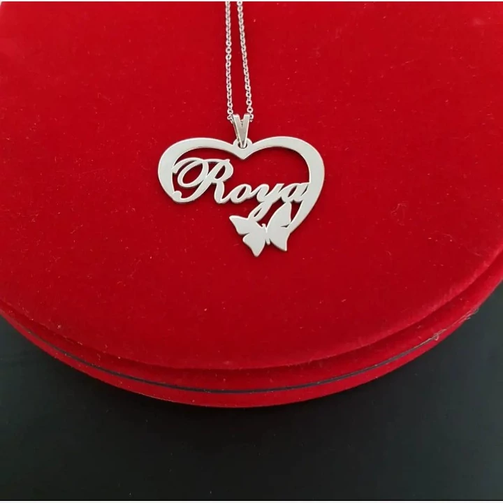 گردنبند نقره طرح قلب و پروانه اسم رویا همراه با زنجیر نقره عیار 925