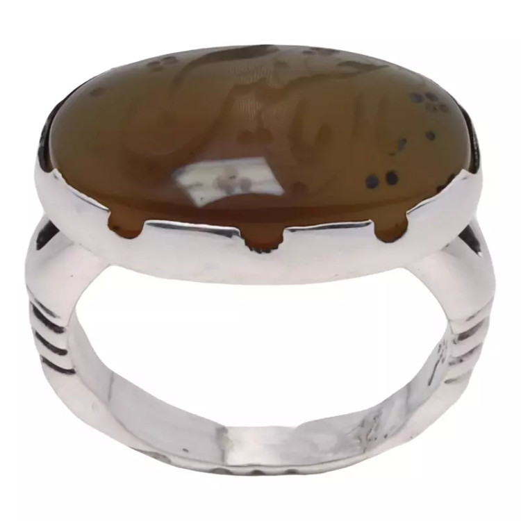 نگین عقیق زرد معدنی تراش قدیم و کلوخه و بکر و معدنی و مزین به حکاکی یا امام حسین ع میباشد