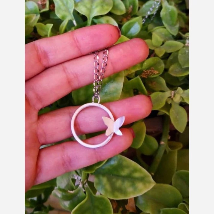 گردن بند مدل حلقه و پروانه و زنجیر نقره کارشده با نقره عیار 925 کار بسیار زیبا و چشم گیر این گردن بند بسیار ترند و جدید میباشد و به دلیل سبک ساده و خاصی که دارید همیشه مد میباشد قابل استفاده برای خانم ها و دختر خانم ها و گزینه ای عالی برای هدیه به خانم ها میباشد وزن کلی گردن بند 7 گرم