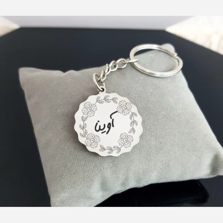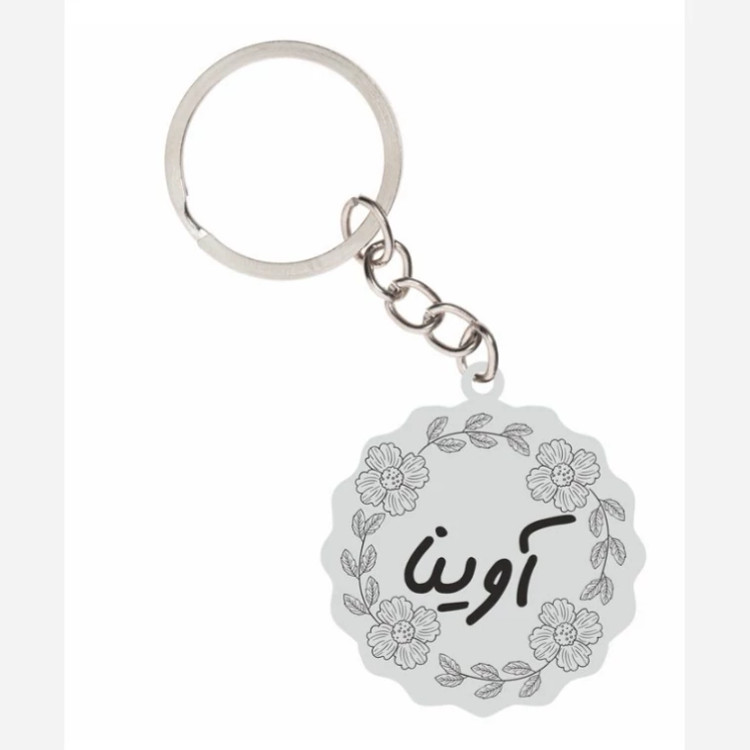 جاسوئیچی نقره دست ساز حکاکی شده اسم آوینا طرح بسیار جذاب و زیبا ساخته شده توسط نقره ساز ماهر طرح لیزری اسم اوینا در وسط کار و مدل گل و برگ دور تا دور حاشیه کار زده شده وزن کلی کار 10 گرم
