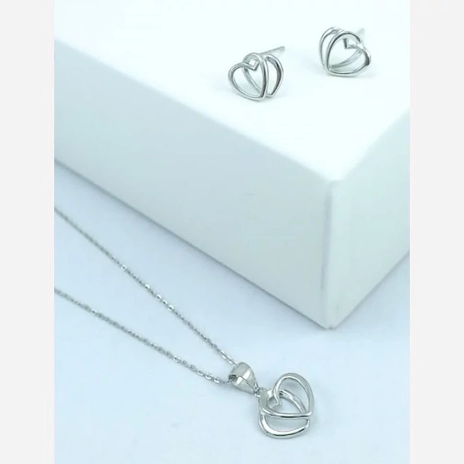 نیم ست نقره قلبی مدل دو قلب شامل یک جفت گوشواره میخی و زنجیر و پلاک نقره کاملا دست ساز ساخته شده توسط استاد ماهر در زمینه نقره سازی کارشده با نقره عیار 925 کار بسیار زیبا و شیک ترند و کار کاملا به روز قابل استفاده برای خانم ها و دختر خانم ها بسیار مناسب هدیه به عزیزانتان وزن کلی نیم ست ۵ گرم
