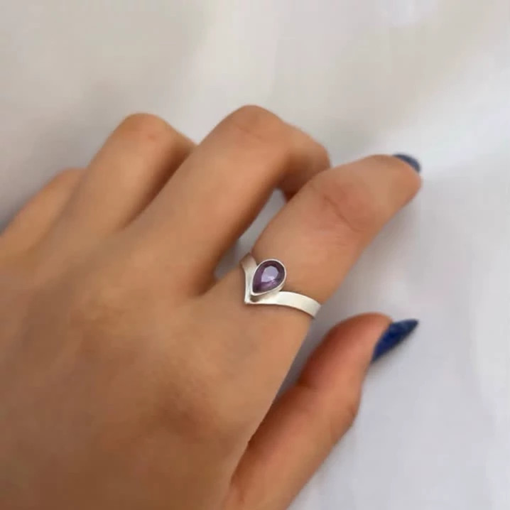 انگشتر آمیتیس طبیعی نقره زنانه کاملا دست ساز کارشده با نگین آمیتیس کاملا طبیعی و معدنی تراش اشکی شکل و نقره عیار 925 کار کاملا دست ساز ساخته شده توسط استاد ماهر در زمینه نقره سازی بسیار زیبا و شکیل کار کاملا به روز و جدید مناسب خانم های شیک پسند هدیه ای عالی برای بانوان وزن کلی انگشتر 11 گرم میباشد