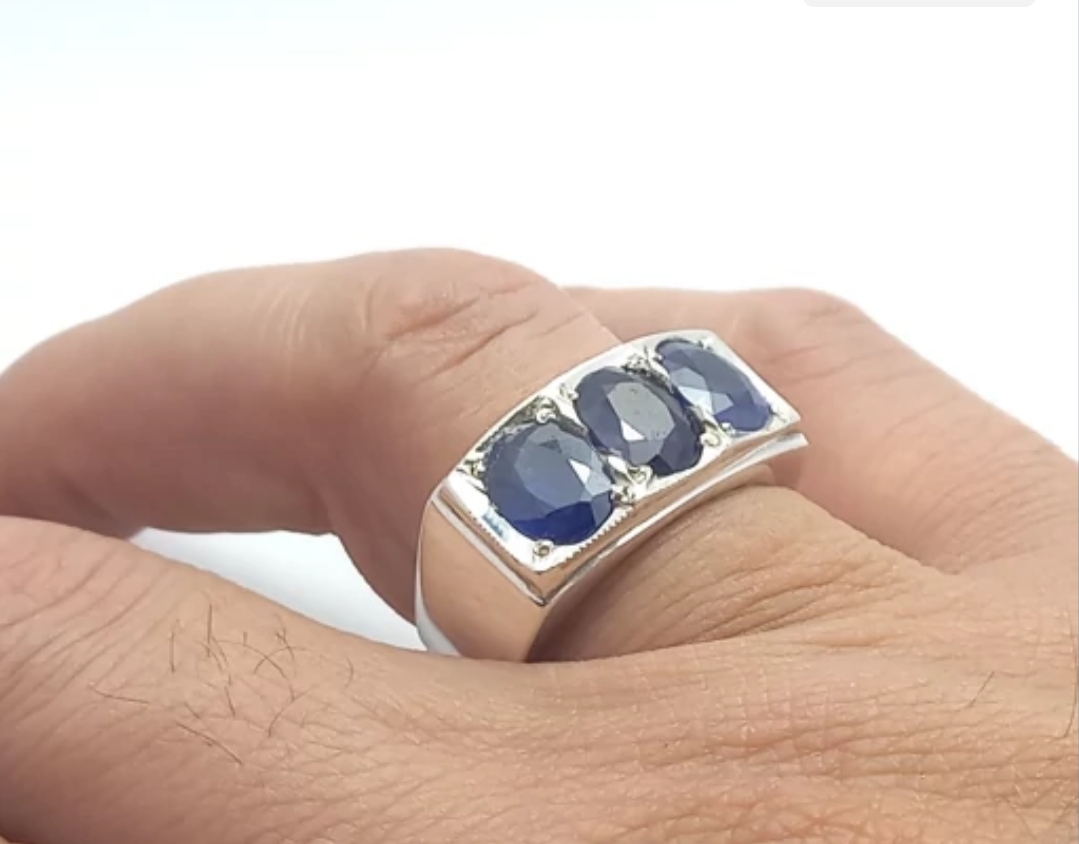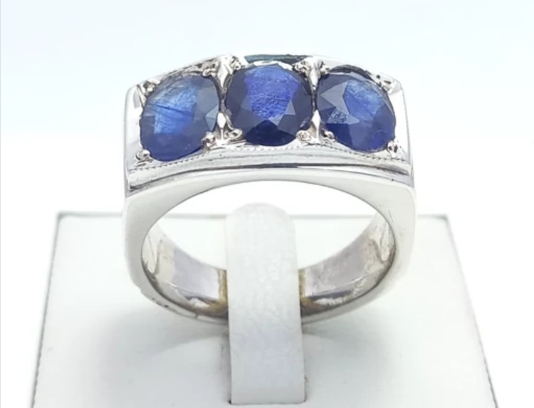 انگشتر نقره مردانه کارشده با سه عدد یاقوت کبود طبیعی و معدنی تراش جواهری