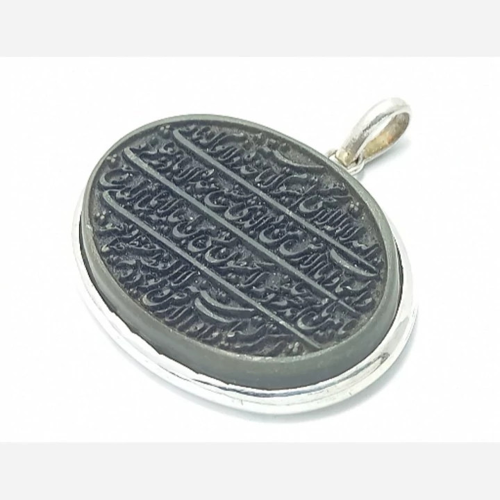 پلاک گردن بند نقره کارشده با نقره عیار 925 و نگین یشم حکاکی شده ایت الکرسی