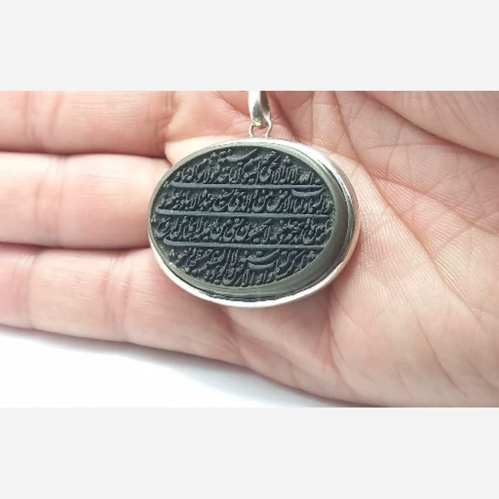 پلاک گردن بند نقره کارشده با نقره عیار 925 و نگین یشم حکاکی شده ایت الکرسی
