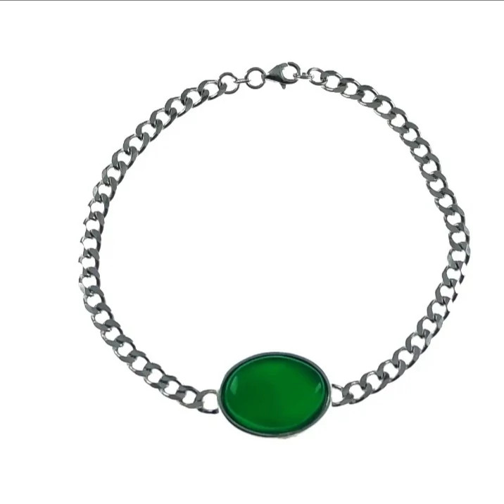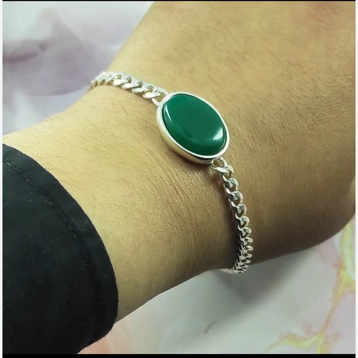 دستبند نقره مردانه کارشده با نگین عقیق سبز تراش تخت و نقره عیار 925