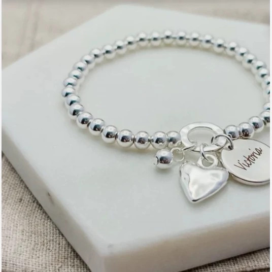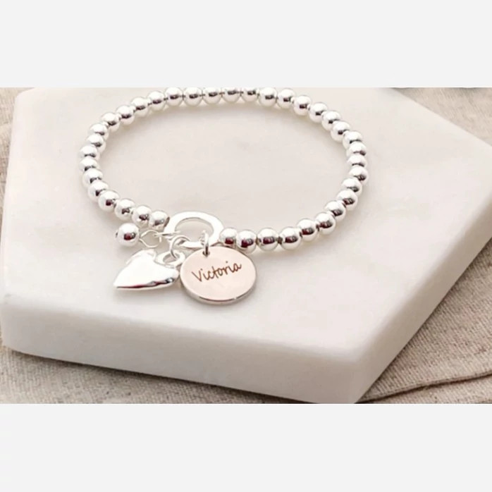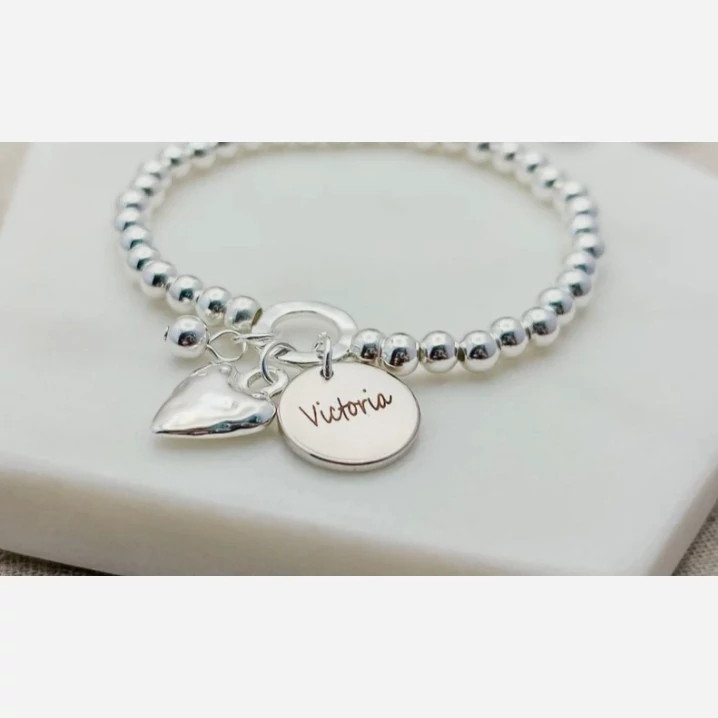 دستبند گوی و اویز حکاکی نقره بسیار زیبا همراه با اویز قلب سه بعدی دست ساز کلمه حکاکی شده در اویز دایره ای شکل دستبند بنا به درخواست شما مشتری عزیز انجام میشود کار شده با نقره عیار 925 ساخته شده توسط استاد ماهر در زمینه نقره سازی کار بسیار ترند و کاملا به روز مناسب استفاده برای خانم ها و دخترخانم ها وزن کار 17 گرم