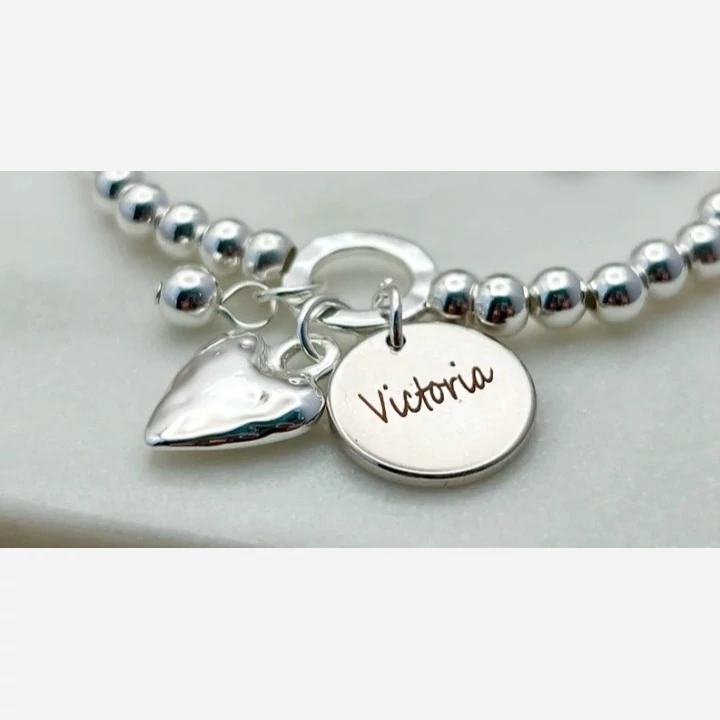 دستبند گوی و اویز حکاکی نقره بسیار زیبا همراه با اویز قلب سه بعدی دست ساز کلمه حکاکی شده در اویز دایره ای شکل دستبند بنا به درخواست شما مشتری عزیز انجام میشود کار شده با نقره عیار 925 ساخته شده توسط استاد ماهر در زمینه نقره سازی کار بسیار ترند و کاملا به روز مناسب استفاده برای خانم ها و دخترخانم ها وزن کار 17 گرم