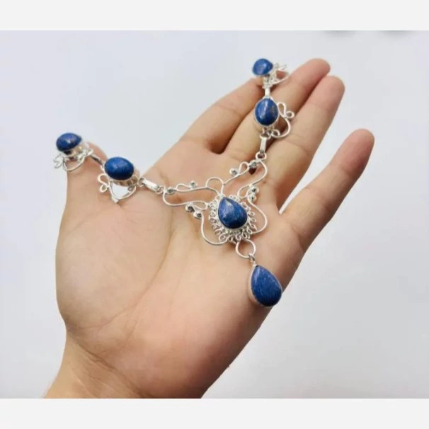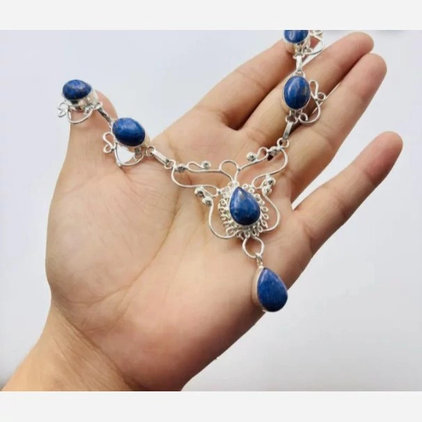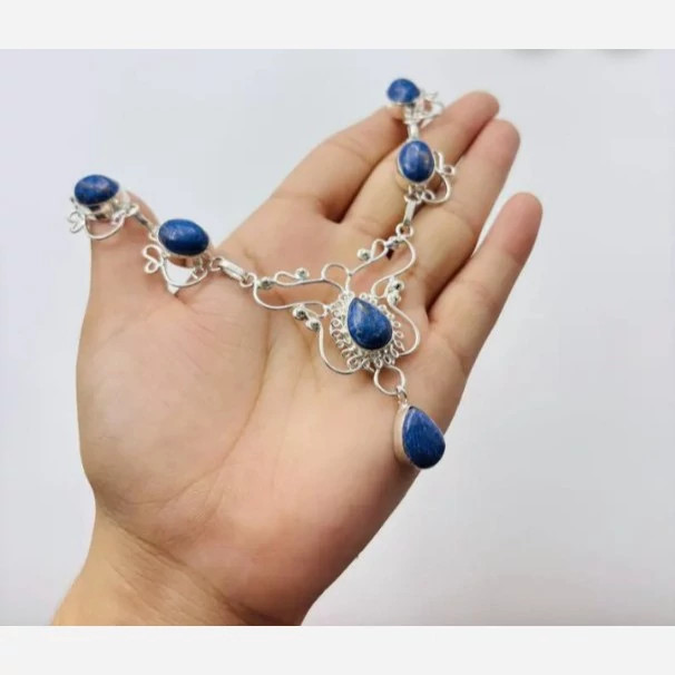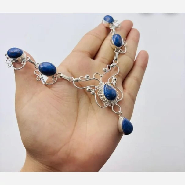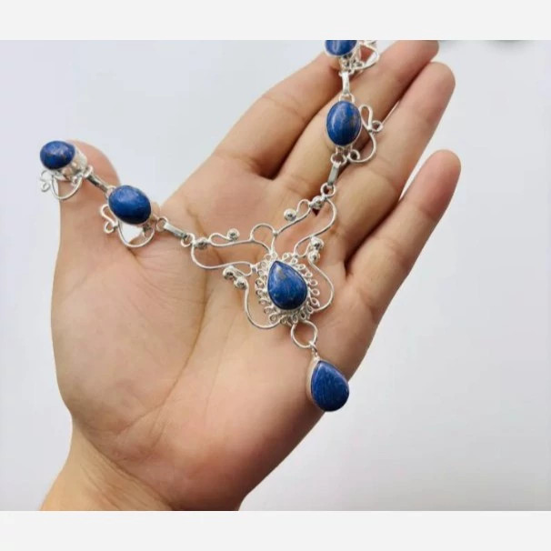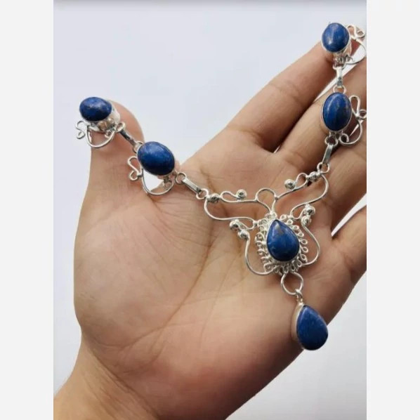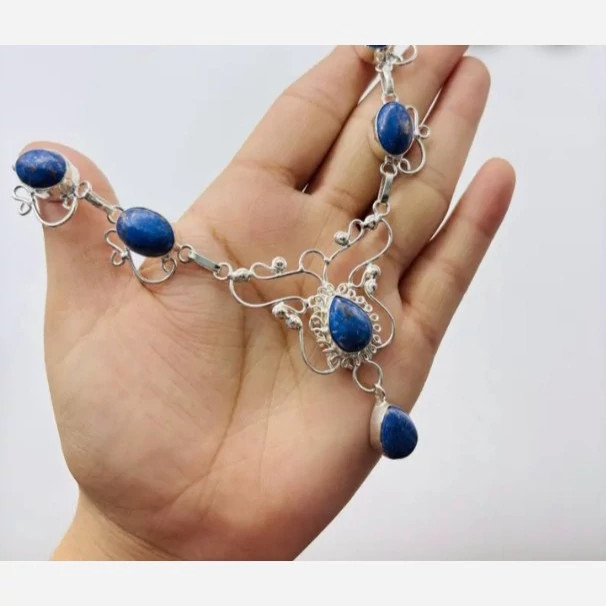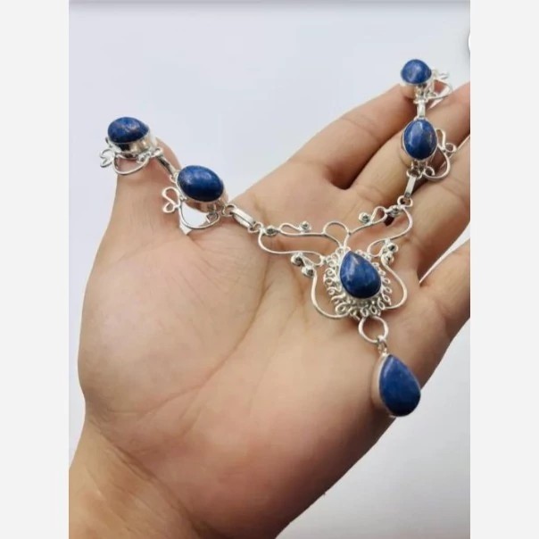 گردنبند نقره دست ساز کار شده با شش عدد لاجورد طبیعی و معدنی کارشده با نقره عیار 925 کار بسیار زیبا ارزنده کاملا دست ساز ساخته شده توسط استاد ماهر در زمینه نقره سازی قابل استفاده برای خانم ها و دخترخانم ها طرح بسیار زیبا مناسب هدیه به عزیزانتان وزن کلی این گردنبند 16 گرم کار بسیار زیبا جدید و خاص ارسال به تمام نقاط کشور