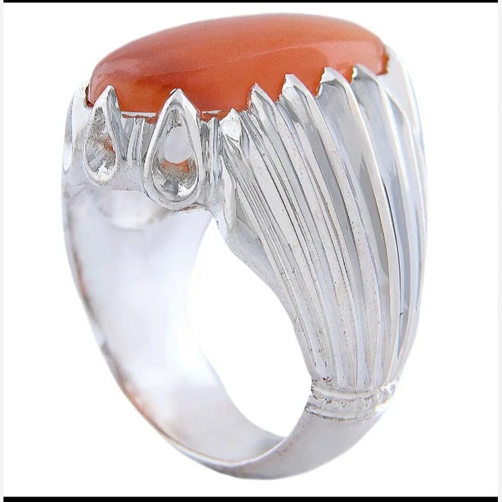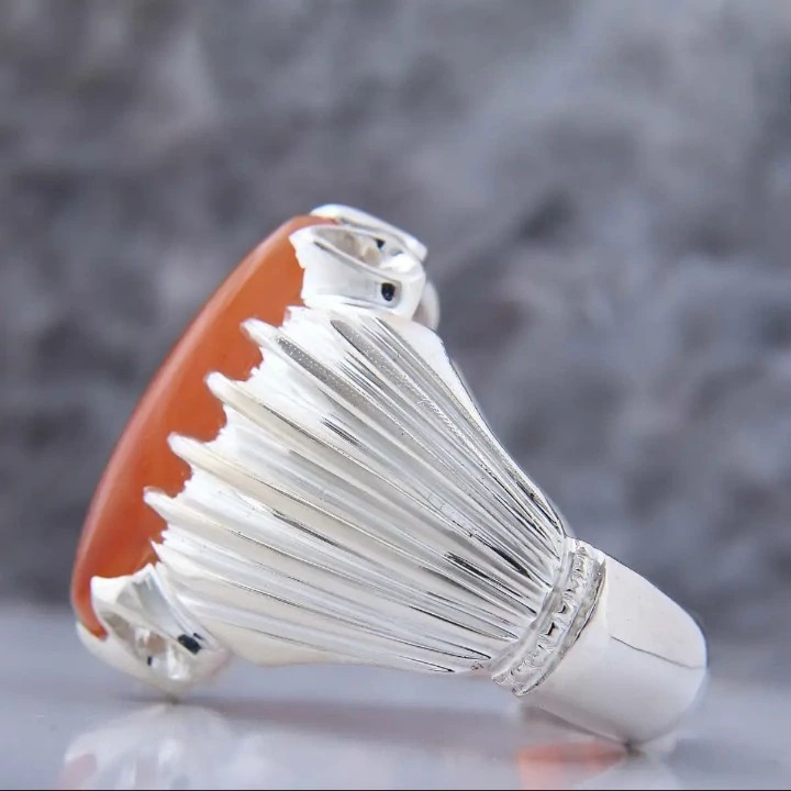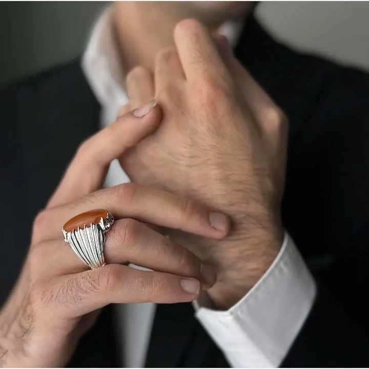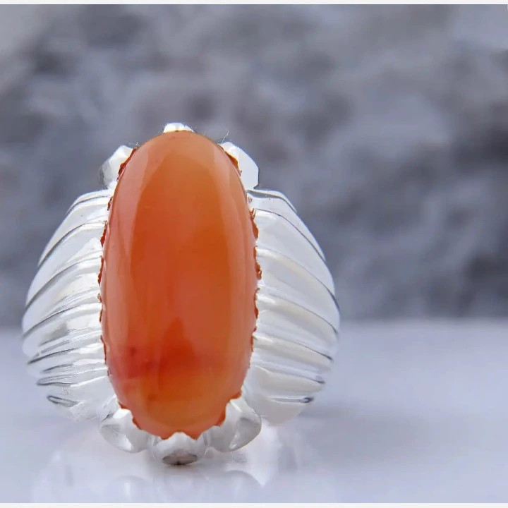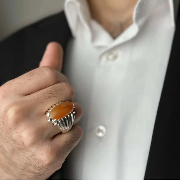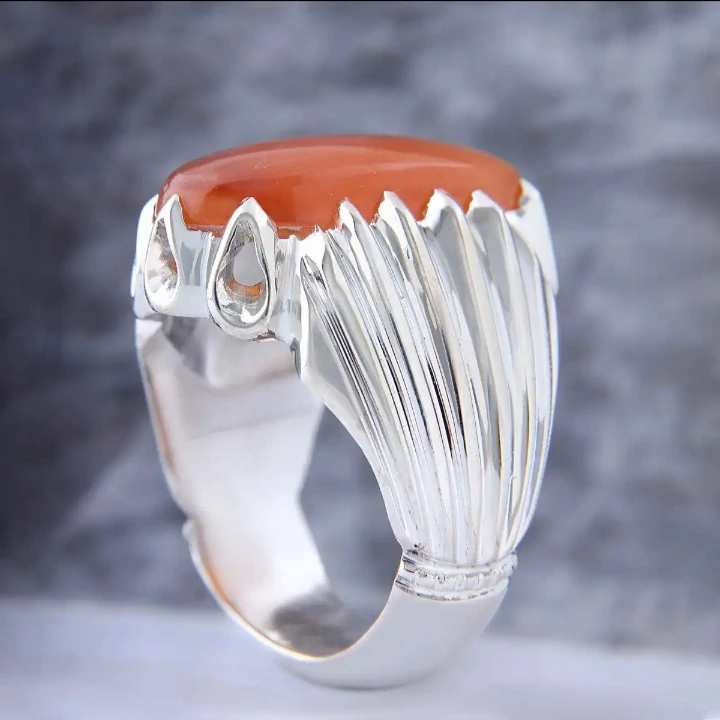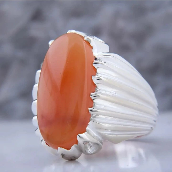 انگشتر عقیق یمن مردانه بسیار ساده و شکیل انگشتر نقره مردانه کارشده با نقره عیار 925 و نگین عقیق یمن پرتقالی کاملا طبیعی و معدنی به وزن دو گرم تراش نگین به شکل بیضی میباشد بسیار شکیل و زیبا مناسب اقایان شیک پسند ساخته شده توسط استاد ماهر در زمینه نقره سازی وزن انگشتر 16 گرم میباشد سایز مد نظر مشتری