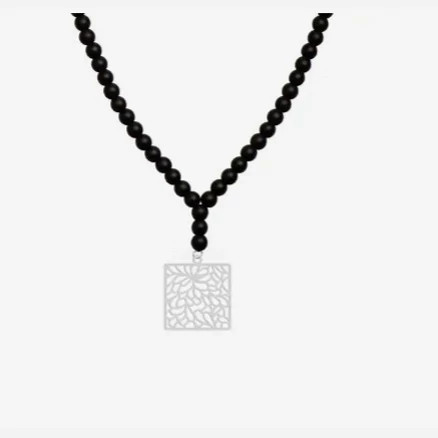 گردنبند نقره مدل قاب گل کارشده با پلاک نقره عیار 925 و اونیکس سیاه