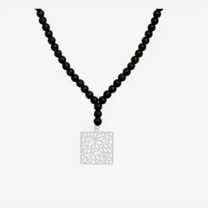 گردنبند نقره مدل قاب گل کارشده با پلاک نقره عیار 925 و اونیکس سیاه