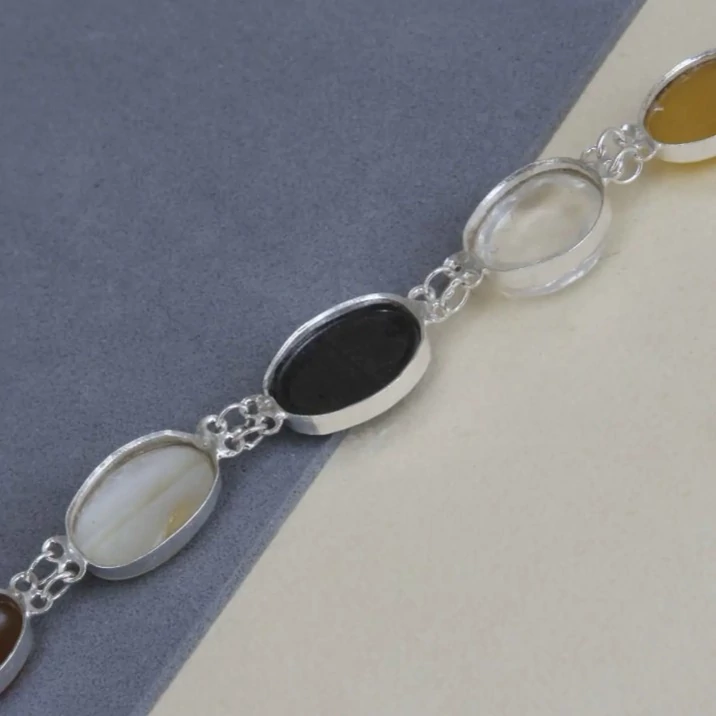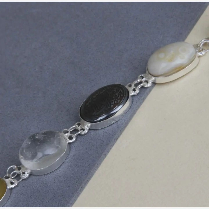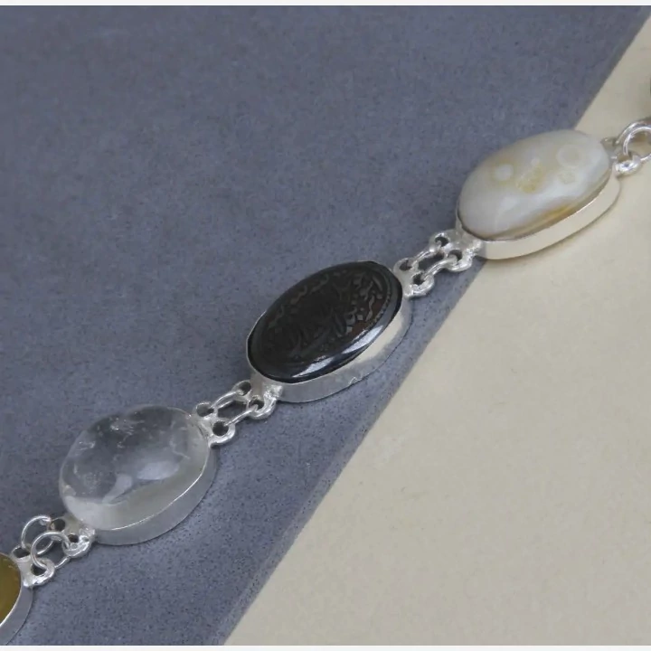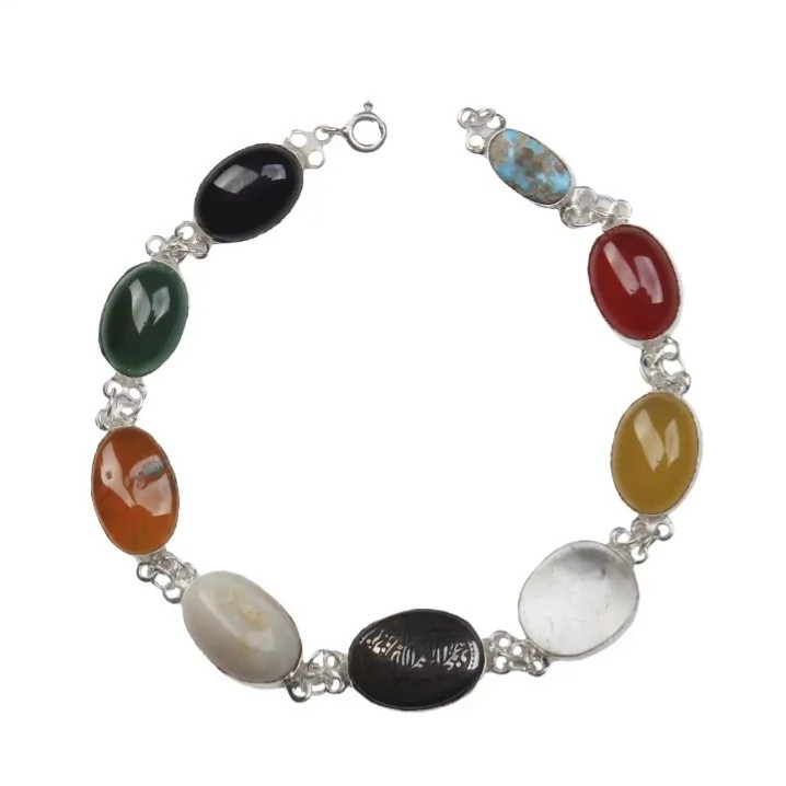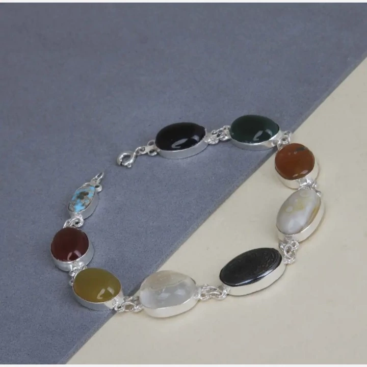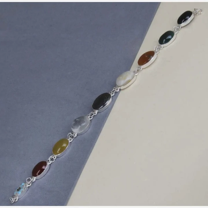 دستبند نقره زنانه 9 جواهر کار شده با 9 عدد نگین طبیعی و معدنی کاملا دست ساز کارشده با نقره عیار 925 ساخته شده توسط استاد ماهر در زمینه نقره سازی کار شده با 9 عدد نگین طبیعی و معدنی به ترتیب اعم از : فیروزه ، عقیق سرخ ، عقیق زرد ، در ، حدید حکاکی شده ، عقیق سلیمانی ، عقیق یمن پرتقالی ، یشم و اونیکس سنتاتیک نگین های طبیعی و معدنی بکار رفته در این دستبند بجز اونیکس که صنعتی میباشد دارای خواص بی شماری میباشند این دستبند فاخر مناسب بانوان زیبا پسند میباشد و بسیار مناسب جهت هدیه به خانم ها وزن کلی دستبند با نگین ها ۲۸ گرم میباشد