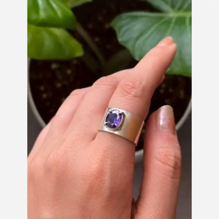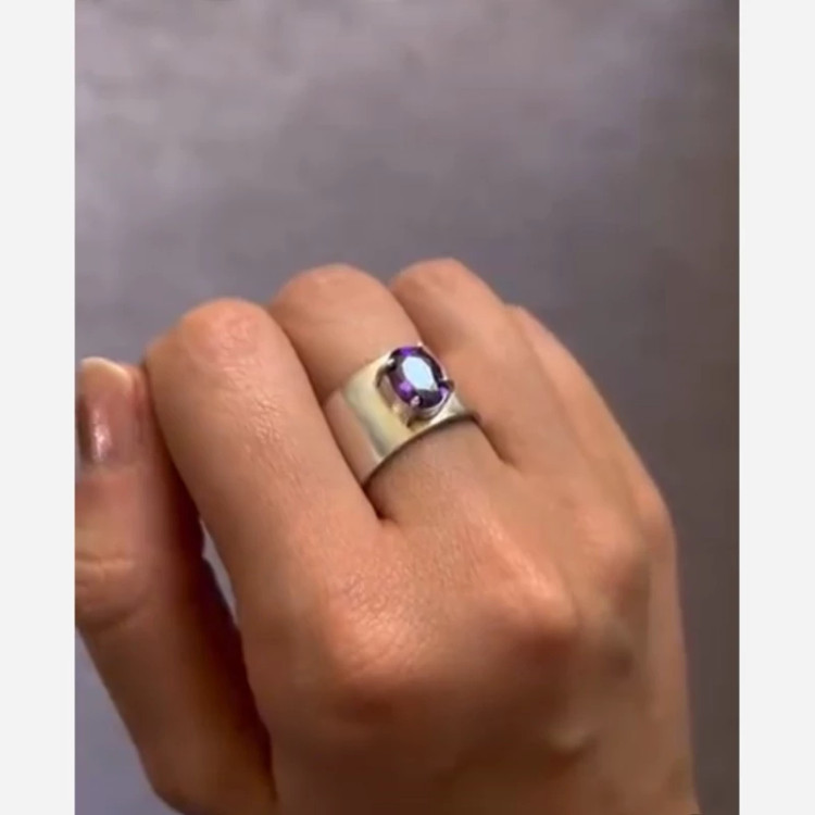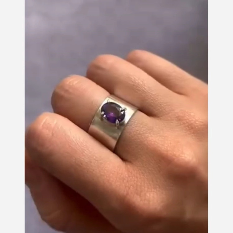 انگشتر نقره زنانه نگین امیتیس طبیعی مدل پهن و ساده کارشده با نقره عیار 925 و نگین امیتیس طبیعی و معدنی تراش جواهری طرح نگین خانه چهار چنگ و بسیار شیک انگشتر طرحی بسیار ساده دارد کار کاملا ترند جدید و به روز مناسب خانم های شیک پسند ساخته شده توسط استاد ماهر در زمینه نقره سازی وزن کلی انگشتر ۱۵ گرم میباشد