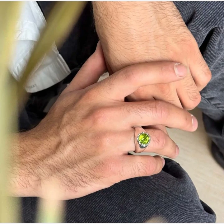 انگشتر زبرجد طبیعی رکاب نقره عیار 925 کاملا دست ساز طرح انگشتر بسیار ساده و شیک مناسب اقایان شیک پسند مناسب هدیه به عزیزانتان نگین خانه زیبا ساخته شده توسط استاد ماهر در زمینه نقره سازی نگین زبرجد طبیعی و معدنی وزن انگشتر ۱۳ گرم میباشد